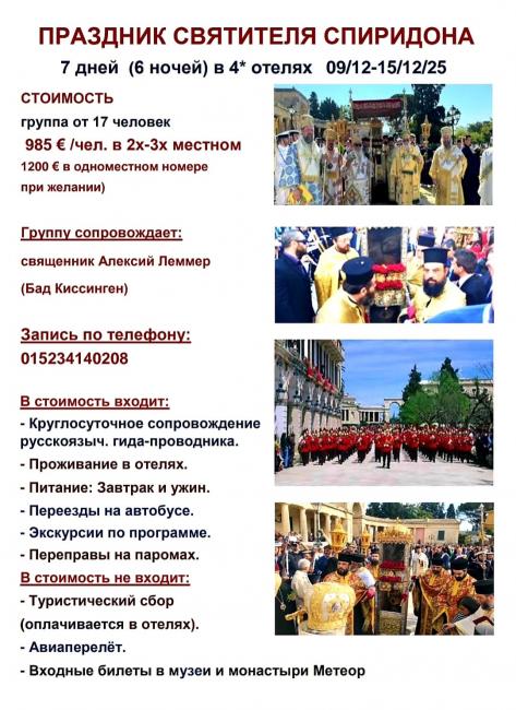09.12-15.12.2025 Паломничество в Грецию By admin on чт, 27.11.2025 - 20:03 Дорогие братья и сестры! От нашей Епархии планируется паломничество в Грецию с 9 - 15 декабря 2025 7 дней и 6 ночей. С вопросами обращаться по указанному телефону. Прикреплённые файлы SPIRIDΟN-PAISIOS 2025_0.pdf Теги Греция
